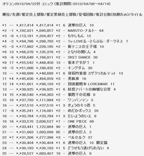 最新一周Oricon漫画销量榜(TOP25部分)