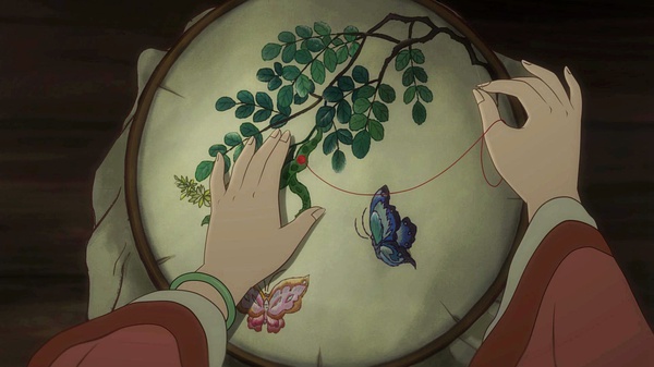 这部新作的细节处理十分到位——少年初桐手里拿着红豆细看时,黑眼珠上有豆大的红色影子;他冒雨去找六娘,跑到六娘家门口,长衫底部被水渍和泥渍弄湿弄脏;六娘用团扇遮半脸,扇面上画的是蝶恋花,少女的心事因此一览无余;初桐撞了生梨摊位,而梨象征着“离”;六娘给初桐的绣花上留下一点血色的红豆,象征着世俗浇灭了郎情妾意后的印痕,一语双关,又是全剧的点睛之笔……制作者的用心和诚意,观众是可以体会到的。