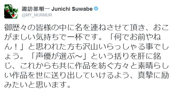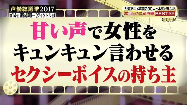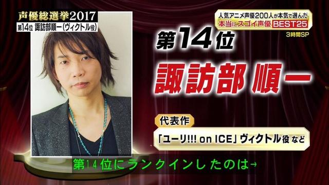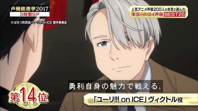 《冰上的尤里》可谓去年的年度热门番,尽管是深夜档动画,但该作的光碟第1卷首周销量就突破了5万张,OST销量也创下近6年最好的动画OST销量纪录。该作在世界各地都拥有众多粉丝,连专业花滑选手也对这部动画非常热捧。而由诹访部顺一配音的维克托的人气甚至超越男主角胜生勇利。在诹访部顺一当选第14名的短片中,先介绍了他在《冰上的尤里》中为维克托配音的出色表现,接着还介绍了他配音的《网球王子》迹部景吾。当选的点评中写道:“用甜美的声音让女性心跳不已的性感声音拥有者”。《冰上的尤里》的影响力和热门度可见一斑。