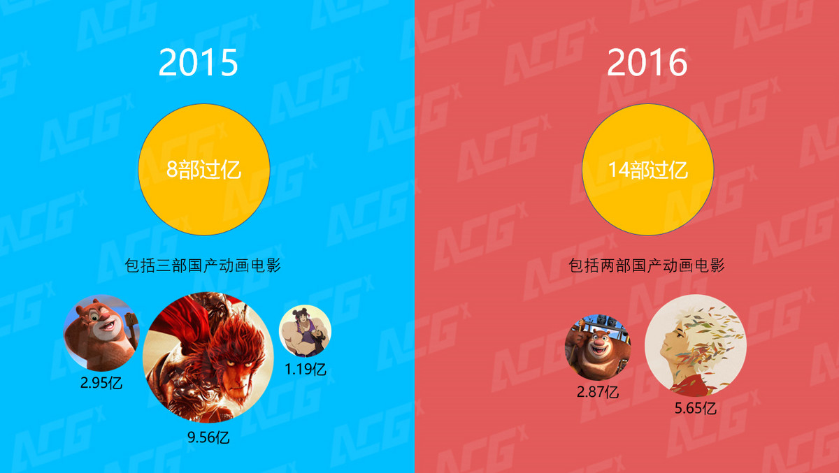2015年过亿级票房的中国动画电影有3部,2016年仅2部。除了《熊出么》在这两年间继续蝉联过亿票房榜单外,前年还有中国院线动画电影冠军《西游记之大圣归来》和源自网络动画的《十万个冷笑话》,而去年仅有一部《大鱼海棠》。