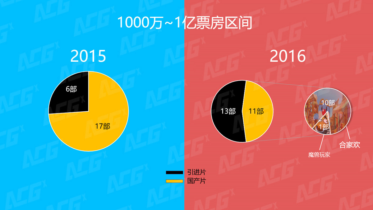 票房在1亿以下、1000万以上的动画电影,2016年的数量为24部。其中美国动画电影3部,日本动画电影5部,中国动画电影11部,其他国家动画电影5部。