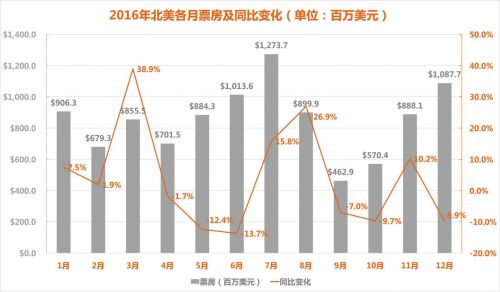 2016年,票房最为突出的是7月份,单月票房12.7亿美元,占全年票房的12.5%,达到影史7月票房新高。在《海底总动员2》、《爱宠大机密》等卖座动画的带动下,2016年我们见证了北美最为火爆的一个暑期档,6,7,8三个月累计票房超过30亿美元,前所未有。暑期之后,缺乏重量级作品的9月份票房最低,仅有4.62亿美元。比之2015年增长最为突出的是3月和8月,同比增长均超过了25%,两个月的冠军影片《疯狂动物城》和《自杀小队》贡献功不可没。5月和6月成为同比下跌最多的两个月,跌幅均超过10%,但两个月本身都有不错的票房产出,大幅下跌更多是由于2015年同期的《复仇者联盟2》和《侏罗纪世界》表现过于强势,拉高了基数。
