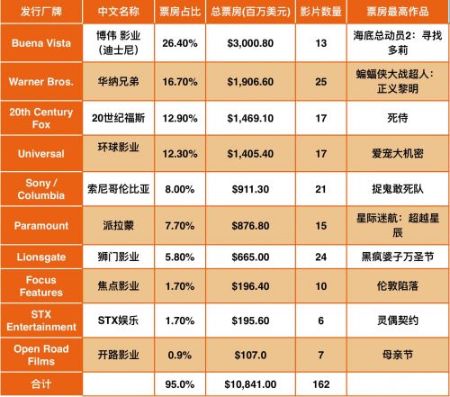 迪士尼在二当家的位置连坐三年后终于翻身成为冠军厂牌,并且大获全胜,遥遥领先于第二名华纳,30亿美元的成绩创造迪士尼发行新高。其成功源于迪士尼本部(疯狂动物城),皮克斯工作室(《海底总动员2》),漫威影业(《美国队长3》),卢卡斯影业(《星球大战外传:侠盗一号》)四大影业部门同时发力,当年的“买买买”政策终于在今日开花结果,其出品并发行的《海底总动员2:寻找多莉》成为2016年票房最高的影片。
