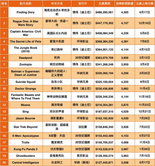 最为亮眼的当属迪士尼旗下皮克斯工作室出品的《海底总动员2:寻找多莉》;这部时隔十三年的续作刷新了北美最卖座动画电影纪录,成为第一部票房杀入北美历史前十的动画影片(排名第七)。年末迪士尼旗下卢卡斯影业的《星球大战:侠盗一号》也轻松刷破多项纪录,很大程度上延续《星球大战7:原力觉醒》的热度。同时“漫威大法”持续吸金,《美国队长3:英雄内战》和《奇异博士》两部漫威宇宙作品分别拿下5月和11月票房冠军。迪士尼本部的原创动画《疯狂动物城》、《海洋奇缘》以及奇幻童话作品《神奇森林》等也都有极佳的表现。