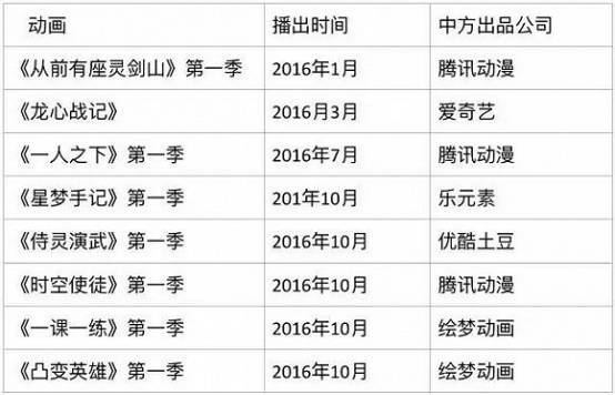 2016年1月8日,作为中日合作动画的开山之作,《从前有座灵剑山》同步在中日两国播出。紧接着,《龙心战纪》《一人之下》《凸变英雄》、《星梦手记》、《侍灵演武》、《时空使徒》和《一课一练》等7部中日合作动画番剧先后出炉,并且都在日本播出。