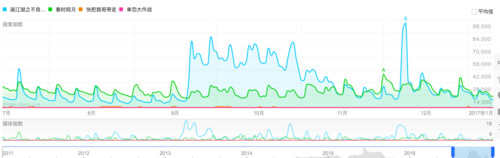 或许是16年《画江湖之不良人》、《秦时明月》等影视剧改编让不少人看到了挣钱的机会,虽然《快把我哥带走》、《单恋大作战》还未正式开播,但漫改真作为粉丝导向的作品,从16年的百度指数可以窥看一二,以下是其百度指数对比: