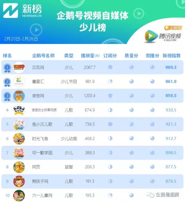 企鹅媒体平台、腾讯视频联合新榜推出腾讯企鹅号视频自媒体排行榜,统计周期为2月20日到2月26日,数据统计截至2月27日12时。