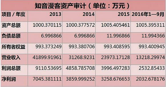 根据资产审计信息显示,2013年,知音动漫的营收为41899.92万元,净利润为7045.38万元;2014年,知音动漫的营收为31268.92万元,净利润为3860.00万元;2015年,知音动漫的营收为23973.17万元,净利润为3258.68万元;2016年1—9月,这个数字进一步缩减为营收13218.30万元,净利润2032.68万元,呈现不断递减趋势。