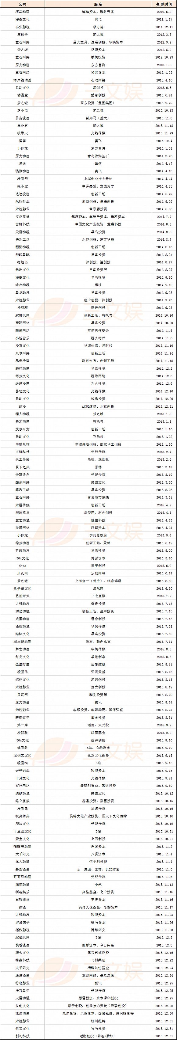 除了分析行业的整体发展和人才流向,资本也是影响行业发展的重要因素。三文娱整理了投资了五家以上动漫公司的资方,我们看到这些资方大概分为四类。
