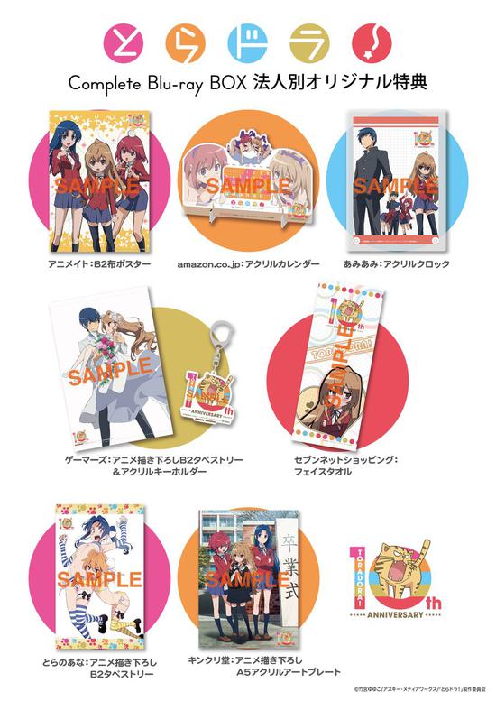 近日,官方公布了10月24日发售《龙与虎 Complete Blu-rayBOX》的消息,并且公开了特典预览图,喜欢收藏的粉丝有福了。并且限定日本地区在官网对最喜欢的名场进行投票,有机会得到钉宫理惠、堀江由衣、喜多村英梨的签名,这就非常令人羡慕了。