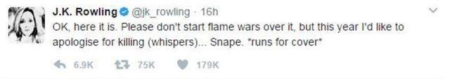 对于J·K·罗琳道歉一事,我们就来看看网友们的看法吧。“我更耿耿于怀的是写死小天狼星啊!”“斯内普教师死了,真的好心酸,虽然他头发很油,前面看的时候很讨厌他。”“斯内普和哈利妈妈的那段爱情超感人。”“斯内普是悲剧英雄,死得其所。”“我咋觉得他的死显得人物更加丰满了呢?”“斯内普教授去世的一段,看小说时就难受得不行,看到他的过去后,就越发伤心了。”“那场大战,的确死了很多人。”“有没有人因为伏地魔的死而伤心呢?我觉得会是林黛玉。”“J婶,你这是每年都要虐我们一下才肯罢休吧。”