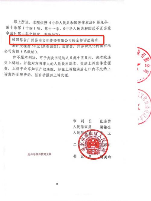 北京市海淀区人民法院判决易动传媒全部诉讼请求被驳回,结果公布后,重要庭审证据包括《吃货宇宙》的影视备案回执等也均被曝光,该备案回执历史久远,明确显示《吃货宇宙》的前身是2007年完成的电影剧本《一角钱拯救世界》,而原告方成立于2008年,其同题材电视动画片上映日期为2014年。对此,《吃货宇宙》出品方天工影业和圣壹门也发出联合声明,对易动传媒的恶意诉讼和不正当竞争行为以及在网络上对导演陈廖宇进行的人身攻击保留进一步追究法律责任的权利,并呼吁同行尊重知识产权,恪守法律底线,实现良性交流合作,为推动中国动画电影市场繁荣发展而共同努力。
