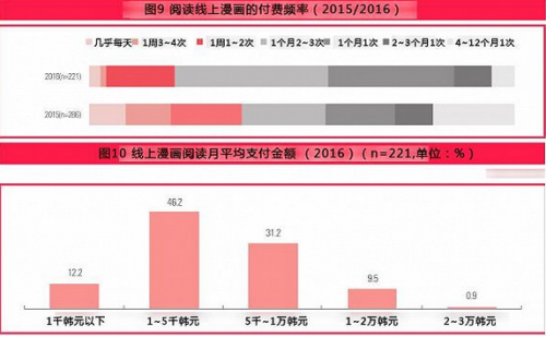 特别是在韩国,根据近日韩国发布的《漫画产业白皮书》显示,20.5%的线上漫画用户表示最近一年中有过付费阅读的经历,35.7%的用户表示“1个月2~3次”,所占比例最高,接下来是“1个月1次”(29.4%),“一周1~2次”(16.3%)等。而从支付的金额来看,支付“1千~5千韩元”(约合人民币6~30元)的用户人数所占比为46.2%,其次是“5千~1万韩元”(31.2%),“1千韩元以下”(12.2%)等。