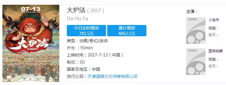 或许在很多人看来,貌似进入2017年之后,国产动画电影方面的表现就显得不怎么给力了。很难找到诸如《大圣归来》或者《大鱼海棠》那种全民狂欢的作品上映。很多动漫迷期待的《大护法》7月13日上映了。截至7月17日晚上,作品的票房已经接近4100万人民币,票房来看实在是差强人意,因为这个成绩被《大圣归来》、《大鱼海棠》甩出好几条街,从票房来看不是一个重量级的作品。