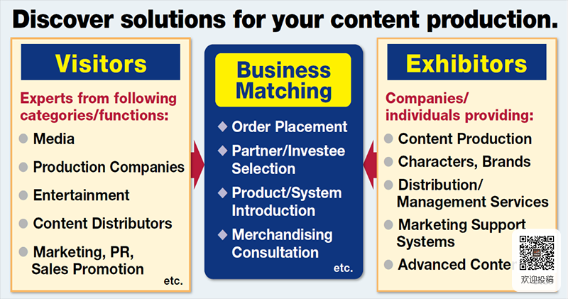 CONTENT TOKYO 是日本最大规模的B2B内容产业综合展会。由7个专业展组成,包含VR/AR/MR, 内容的创意,制作,形象/品牌授权,内容分发,管理和市场营销,是全面展示内容产业所有环节和元素的综合性展览会。
