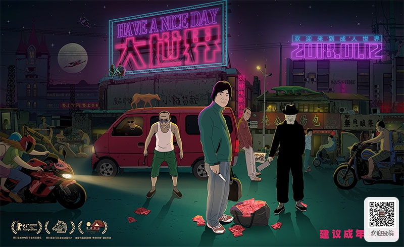 短短一个星期里,从更名到定档,《大世界》不断占据着电影新闻版面的头条。而在刚刚落幕的第54届台湾金马奖上,获得了三项提名的《大世界》更是不负众望,夺得了最佳动画长片的殊荣。相信大部分影迷第一次听说这部刚刚改名为《大世界》的电影,是在今年的第67届柏林电影节时期。那时还叫做《好极了》的《大世界》,获得了金熊奖最佳影片的提名。作为首部入围三大电影节主竞赛单元的华语动画长篇,《好极了》在一夜之间给华语电影注入了一针突如其来的强心剂,冬季还未结束的二月,华夏大地被这支从欧洲传来的佳音震撼到热血沸腾。转眼在不久前的第一届平遥国际电影节上,刘健导演又借助此片获得了“费穆奖”最佳导演奖。一时之间,这部其实还并未有很多人一睹真容的动画电影,成为了广大影迷茶余饭后不容错过的话题。金马奖最佳动画长片:《大世界》从柏林到平遥,从平遥到台北,《大世界》早已开始了它的世界之旅。今年8月份的墨尔本电影节上,《大世界》也是作为唯一的一部华语动画电影与澳洲的观众见面。而在这届电影节上,除了几部华语短片电影外,只有两部华语长片得到了展映名额,除了《大世界》,另一部则是在2016年同样大放异彩的《再见瓦城》,足见《大世界》在国际电影市场上所获得的认可程度确实相当之高。墨尔本电影节上,《大世界》甚至出现了一票难求的盛况,看着影片开场前排在影厅外望不见队尾的外国观众,当时在现场的中国人们真的觉得特别自豪。环游各大电影节,斩获无限爆棚的口碑后,《大世界》终于定档2018年1月12日,很快就会为全国观众揭开它的这层神秘面纱。一部动画电影,竟然可以搞得出如此这般大的声音。《大世界》究竟牛在了哪里?如果用一句话总结《大世界》的故事,可以说是“一百万块钱引发的血案”。从工地司机小张为女友整容而偷走老板的一百万巨款开始,多米诺骨牌哗啦啦的不断倒下。故事的感觉会让人想起《罗生门》或《心迷宫》,一人错,人人错,最终导致整个故事剪不断理还乱,《大世界》的观影体验是一种循序渐进的不断刺激,不断高潮。层层叠起,扑朔迷离,众多支线最终形成闭环,所有与这场闹剧有所瓜葛的命运最终汇聚一起,殊途同归。然而,《大世界》却没有刻意同类似故事的电影一般去强调“高智商”,如果觉得影片还是很难理解或者跟不上思路,那大抵是“脸盲”或者“人名盲”,因为《大世界》确实有太多的人物,太多的巧合。但它却用一种极简的方式将这条看似越来越乱的故事清晰的表达清楚,因为它将焦点更多地放在了呈现“现实”之上。通过这样一场荒诞的黑色幽默,来刻画人性,刻画当今的社会现状,留下一个又一个有趣的迷思。它用一种“超现实”主义的表达方式来表达“现实”,并用一种“非典型”人物的诠释来勾勒“典型”。这样一部故事性极强的电影,在观影过程中由于线索的众多而来不及思考,却能在观影结束的瞬间感受到细思极恐的内核。“费穆奖”最佳导演奖的颁奖词这般说道:“本片导演从自己的现实经验出发,对动画语言进行了创造性的开掘,将严肃的异化主题以生动的演绎,用幽默含蓄的处理间离了暴力场面,叙述简洁有力,表达准确、犀利,这不仅仅是一部风格独特的非常优秀的动画影片,也是一个具有启示意义的电影文本,它拓宽了中国电影的表达空间。”有人说《大世界》的画风清奇,也有人说《大世界》的画风重口,实际上,《大世界》通过它二维动画所特有的“简单感”,更好的让它所想表达的荒诞氛围呼之欲出。影片里的世界看似异常熟悉,终日施工的工地,总有那么几个灯管坏掉的广告牌,有着泡面味道的网吧,夏日雨季里前台很是破败简单的小旅馆。一个仍在等待着开掘发展的小镇感油然而生。然而,影片里的世界又似乎很是模糊,是上个世纪末,却也能有种未来的末世之感。这份矛盾,从画面到气氛,最终传递到了社会背景和人物勾勒之上。通过底层人物描摹当代社会,是《大世界》非常成功的一个亮点,完成度相当之高。这也决定了《大世界》更像是一部文艺电影,它的观众定位也因此而非常精准。但是“小众”并不等于“不大众”,影片所想表达的,依然是普世的思考。动画只是它的一种表达形式,这并不能作为观影的一道门槛。虽然这个故事通过真人演绎也会同样精彩,但影片中很多脑洞大开或是天马行空的表达,又是只有动画的形式才能更好的传递。所以《大世界》最终呈现给观众的,就是这种“一切都刚刚好”。无论是《好极了》还是《大世界》,电影的片名都传递了一种极致的感觉。而这又“极”又“大”的故事,其实只是发生在南方的一个小小城乡里。影片的英文名是《Have a nice day》,整部电影的故事也确实仅仅发生在一个昼夜之间。以小见大,也正是这部黑色幽默影片最具讽刺表达的设计。而这“好极了”“大世界”“Have a nice day”,仔细想来,又像是网络聊天时的“微笑”表情,或者“呵呵”二字,是不是一种反话,也要交给每个观众来做出属于自己的理解了。被很多看过该片的观众所津津乐道的,是《大世界》里提出的一个问题。影片中,生活在这个大世界却并为见过这个世界之大的人物问了这样一个困惑:佛教和基督,哪个更厉害呀?如果佛祖和耶稣打架,谁会更胜一筹呢,如此大胆的问题,足以窥见《大世界