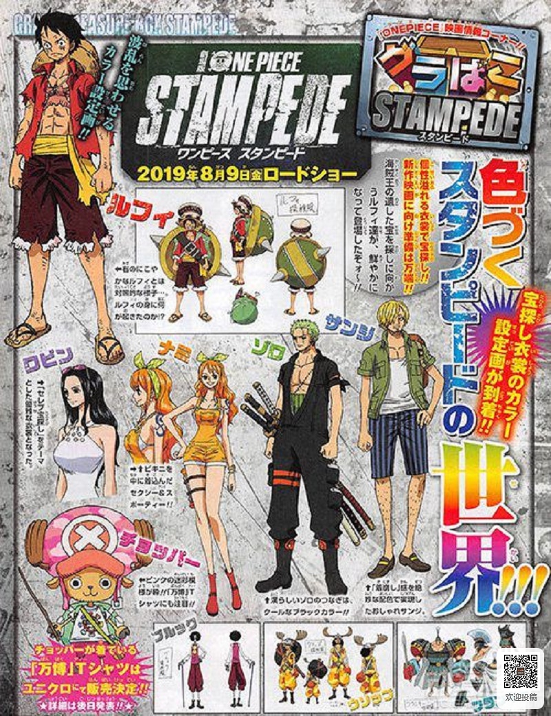 《海贼王》20周年剧场版《海贼王 STAMPEDE》在近日公开了草帽团的最新冒险服装人设图,这次公开的都是上色版。两个妹子的服装都是非常有个性,罗宾的白色上装依旧非常显身材,而娜美则是走的可爱+性感的路线,减龄不少但是身材依旧劲爆。男生的服装也都是比较帅气,只有路飞的有点一言难尽,背上的那个造型也是很亮眼啊。这次剧场版的人设由尾田老师亲自设计的。