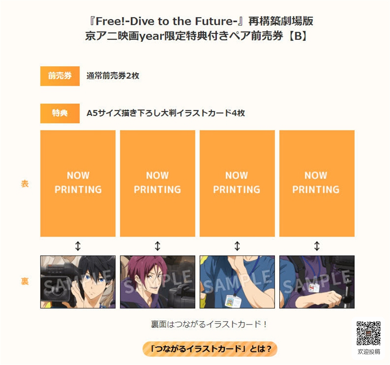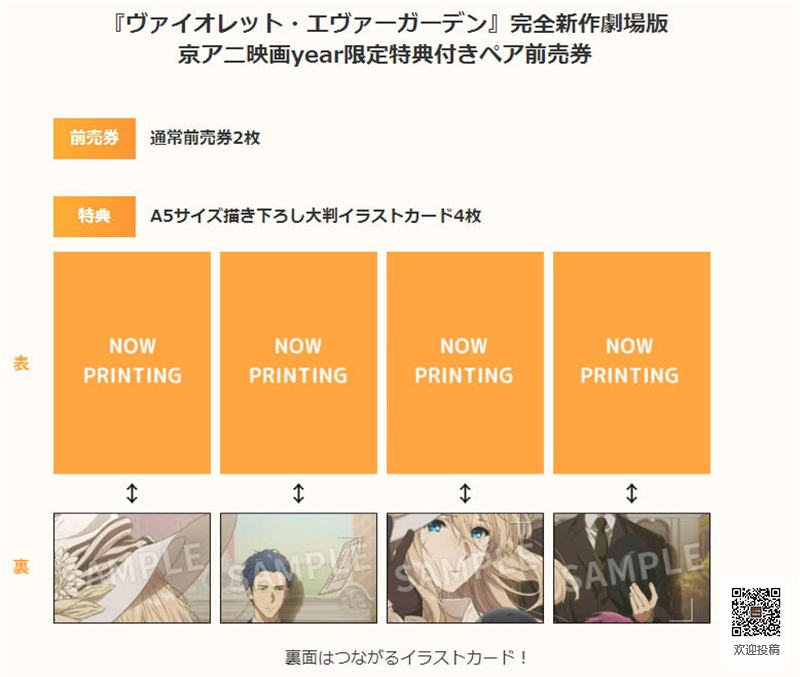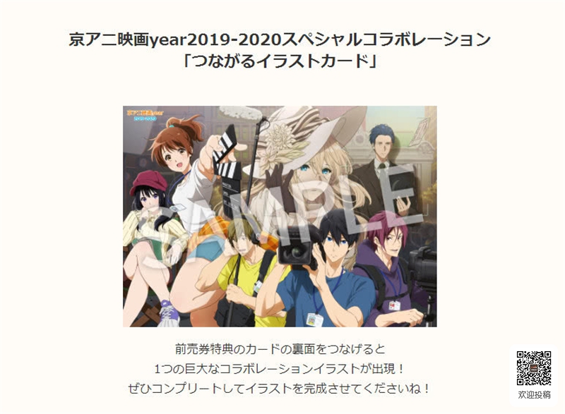 目前,“京阿尼电影年2019-2020”中已经列出了将于2019年4月19日上映的《剧场版 吹响吧!上低音号~誓言的终章~》、将于2019年7月5日上映的《Free!-Dive to the Future-再构筑剧场版》、将于2020年1月上映的《紫罗兰永恒花园 完全新作剧场版》,官方还预定实施跨作品活动和企划。本次公开了各个剧场版的预售券情报,以及特别联动“链接插画卡”。
