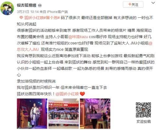 活动结束后,不少来到现场的粉丝在社交平台上为活动点赞,表示“和一群同自己一样热爱狐妖的小伙伴一起热血澎湃、一起唱战歌真的很开心。”