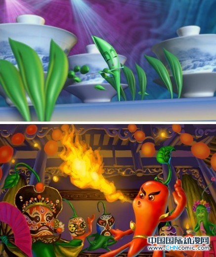 在《太阳出来喜洋洋》的背景音乐中,太阳鸟标识旋转,幻化成一口热气腾腾的大锅。“呼”地一下,锅里涌现一群跳舞的辣椒,红的绿的,跳出不同的图案,像万花筒,美仑美奂。活力、动感的乐场里,小辣椒开始练功夫、舞蹈,汤沸腾起来,变成艳丽的红色涌向镜头。一个古香古色的成都老戏台,小辣椒一个跟斗跳落台上,老戏台的灯一下全亮了,变得生机勃勃。小辣椒亮相,吐火,背景是众辣椒川剧变脸……