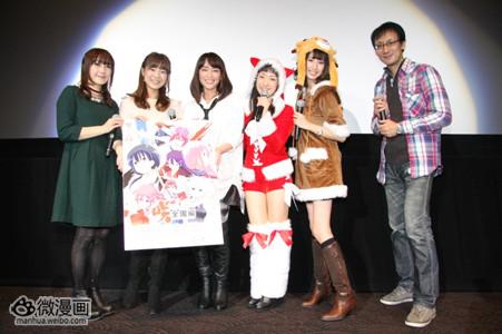 预定1月5日在东京电视台开播的百合麻将动画新章《咲-Saki-全国篇》在22日于东京TOHO六本木剧场举办先行上映会,现场上映了全国篇特别映像和第1话本篇。现在这段特别映像也已经在网络上流出,全国篇大量新角色依次登场!另外《咲-Saki-全国篇》BD/DVD也在同日开始预订。根据Amazon情报,和此前电询北海道电视台的消息不同,动画很可能是全7卷(全13话)。BD第1卷初回特典为小林立(漫画原作者)、五十岚亚栗(《阿知贺篇》漫画作画)、木吉纱(四格漫画《咲日和》作者)、大和田秀树(外传短篇《立-Ritz-》作者)参加执笔的特别短篇漫画。出席EVENT的有动画监督小野学、声优植田佳奈(宮永咲役)、小清水亜美(原村和役)、赤﨑千夏(狩宿巴役)、佐藤利奈(臼沢塞役)、歌手橋本美雪。因为正值圣诞期间,植田佳奈和小清水亜美分别打扮成了圣诞老人和驯鹿。(屏录渣画质)【放送情报】东京电视台 1/5(日)25:35~(第1话为26:05~)大阪电视台 1/7(火)26:10~爱知电视台 1/5(日)25:35~濑户内电视台 1/9(木)26:15(第1话为26:45~)北海道电视台 1/10(金)26:30~TVQ九州放送 1/5(日)26:30~AT-X 1/11(土)26:30~(另有重播)【发售情报】2014/03/19 \7,140 「咲-Saki- 全国編」 一2014/04/16 \7,140 「咲-Saki- 全国編」 二2014/05/21 \7,140 「咲-Saki- 全国編」 三2014/06/18 \7,140 「咲-Saki- 全国編」 四2014/07/16 \7,140 「咲-Saki- 全国編」 五2014/08/20 \7,140 「咲-Saki- 全国編」 六2014/09/17 \5,040 「咲-Saki- 全国編」 七2014/09/17 \9,240 「咲-Saki- 全国編」 七 初回数量限定特装版【STAFF】原作:小林立监督:小野学助监督:瀬藤健嗣系列构成:浦畑達彦动画人设:佐々木政勝动画制作:Studio五组OP主题歌:桥本美雪「New SPARKS!」ED主题歌:姫松高校?永水女子高校?宮守女子高校「この手が奇跡を選んでる」【CAST】宮永咲:植田佳奈原村和:小清水亜美片岡優希:釘宮理恵染谷まこ:白石涼子竹井久:伊藤静須賀京太郎:福山潤神代小莳:早见沙织狩宿巴:赤﨑千夏滝见春:水桥香织薄墨初美:辻亚由美石户霞:大原沙耶香上重漫:伊达朱里纱真濑由子:佳村遥愛宕洋榎:松田颯水愛宕絹恵:中津真莉子末原恭子:寿美菜子小瀬川白望:長妻樹里爱丝琳·威夏尔特:水野麻梨子鹿仓胡桃:丰田萌绘臼泽塞:佐藤利奈 姉帯丰音:内田真礼