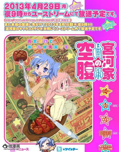《幸运星》外传漫画《宫河家的空腹》此前宣布动画化并预定4月29日开始在视频网站USTREAM播出。现在动画声优阵容公开,《幸运星》本篇角色的声优仍将延续原班阵容,平野绫出演泉此方,加藤英美里和柊司出演福原香织,今野宏美出演小神晶。其他角色方面,两位女主角宫河日影和宫河日向将由两位新人声优川崎琴和岛形麻衣奈出演,其他配角声优也有不少是新人声优。另外动画中的路人角色和《幸运星》一样,将由立木文彦、KUJIRA两位老牌实力派声优出演。 《宫河家的空腹》是连载于《月刊COMPACE》(角川书店),由美水镜创作的《幸运星》外传漫画,讲述的是OTAKU、花钱大手大脚的姐姐宫河日向,以及能干的小学生宫河日影之间的“姐妹爱”故事。漫画版自2007年开始在隔月刊《COMP H's》连载,而后转移到《月刊COMPACE》,目前单行本1卷已发售。根据此前报道,这次动画将由曾指导《幸运星》第1~4话的山本宽担任监督,系列构成和《幸运星》一样是待田尚子,角色设计是新人池屋守,动画制作是山本宽创立的动画会社Ordet。【STAFF】企划:安田猛、竹内宏彰企划协力:池田东阳原作和作品兼修:美水镜监督:山本宽系列构成:待田尚子角色设计:池屋守 音乐:前山田健一 音响监督:鹤冈阳太 制片人:加藤淳、小林健一制作:Ordet、Encourage Films 【CAST】宫河日影:川崎琴宫河日向:岛形麻衣奈内海雪菜:曾和圆香小池爱丽卡:岩崎可苗水岛大辅:小田果林大沢和彦:松冈禎丞小泉麻里奈:山田奈都美兄沢命斗:关智一宫河日影的同级生等:立木文彦、KUJIRA泉此方:平野綾柊镜::加藤英美里柊司:福原香织小神晶:今野宏美【主题歌】OP《KACHIGUMI》歌:泉此方、柊镜ED《MEKAGUMI》歌:宫河日向、宫河日影【官网】http://miyakawahungry.com/