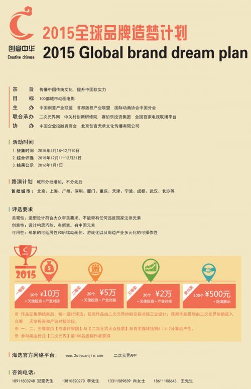 每一个人都拥有自己的梦想。为了鼓励更多有梦想的人实现自己的梦想,由中国创意产业联盟、首都版权产业联盟、国际动画协会中国分会主办,赛伯乐投资集团、中关村创新研修学院、二次元界网、全国百家电视台联播平台承办,中国企业投融资商会、北京创音天承文化传播有限公司协办的“创意中华2015全球品牌造梦计划启动仪式发布”将于本月18日上午在北京金台艺术馆举办启动仪式。今天上午,主办方组委会(筹)向与会嘉宾和媒体提前发布了活动内容预告,以帮助参会者了解详情。“创意中华2015全球品牌造梦计划”首先选定了动漫行业,并将陆续主办各类文化创意活动。创意中华活动将以“互联网+路演”的创新模式,针对中国新型10大类行业,悬赏征集千个动漫游戏IP,巡回路演各大城市,辐射国内的主要大学,打造多部城市电影,孵化塑造评选具有人气和粉丝的中国动漫品牌,助推当地城市和制造业转型升级,全力推动大众创业、万众创新。创意中华造梦计划每年都投入大量资金以支持中国的文化创意事业,为“大众创业,万众创新”献出自己的一分力量。本年度的创意中华活动旨在鼓励动漫行业的创业者积极加入创意中华造梦计划活动。今年的创意中华活动为期8个月,活动面向全中国范围内有志向的动漫人展开,以“动漫形象+故事”为命题,题材涉及海洋、航天、还有城市文化、环保、科技等只要你能想到的创作内容。如果你是动漫人,只需拿起画笔,带着你的梦想和创意,上传作品到二次元界,或拨打报名热线即可参与。活动用以帮助更多有梦想的动漫人实现自己的动漫梦,繁荣中国的文化创意和动漫产业。今年,创意中华活动、中国创意天使投资团发起寻找100个有梦想的动漫大咖活动,让具有原创精神动漫创作者梦想成真。百名大V抢注微宅,活动参赛前60名获奖者,除了将得到总奖金260万人民币的高额奖金之外,还可以获得产业预订、天使投资直投、后期增值收益、路演推广、创业培训、城市动画电影众筹落地、文创基金联投、动漫+传统行业新三版上市、文创项目政策扶持等各种真正为动漫人着想的实惠和福利。创意中华活动激励动漫人将梦想化为现实,帮助动漫人走上创富之路,让创意融入到动漫人自己的事业中去,从而最终实现动漫人的动漫梦想。发布会活动中,中国创意产业联盟副主席王英将阐明创意中华造梦计划的重要意义。首都版权联盟秘书长韩韩志宇、国际动画协会中国分会会长李中秋将分别阐明为什么联合主办创意中华活动,并提供哪些资源对接。另外,发布会现场,创意中华2015造梦计划还将举行中美动漫行业,美方将对动漫形象等版权是如何保护的、中美双方如何强化创意产业的交流与合作、中美双方如何就创意人才培养问题进行合作等几方面展开隔空视频对话。随后,在创意中华2015造梦计划承办方高峰对话环节,二次元界董事长谢景志、中关村创新研修院院长张国庆、赛伯乐投资集团CEO杜豪、全国百家电视台联播平台秘书长赵蒙欣,都将就创意中华活动和动漫产业有精彩发言。将分享创意行业、投资行业和电视媒体的近期的动态,将对互联网+的发展方向进行分析。动漫行业是创意中华造梦计划第一个接入的行业。活动离不开想拥有动漫梦的从业者的支持。在创意中华造梦计划参与各方的高峰对话环节,将有漫画家建晓东、北京电影学院动画学院院长李剑平、中关村动漫协会秘书长马云飞、传统制造业转型先锋福建小野豹服装集团CEO陈永恒、百度动漫营销部总监王宏佳、百城百校活动负责人冯午生、二次元界COO张涛将就动漫产业和创意产业如何结合展开从业者们的交流对话和经验分享。另外,在创意中华2015造梦计划承办落地方案环节,将重点推荐百城联盟“五个一工程”:一部城市动画大电影、一个城市新会展模式、一个创意人才工程、一个创意小镇、一支文创基金。用创意打造生态链,助力中国创意产业发展。在此环节,中国创意产业联盟常务副主席杨志勇将就创意中华2015造梦计划的百城联盟发出倡议、二次元界副总经理李洋就百名动漫作者提出邀约、中国创意产业联盟动画产业中心副秘书长张亮就中国创意天使投资团发起倡议,将分别进行发言。动漫作者拿起笔画,就能创造一切。但动漫人遇到的现实境况却是无比坚难。希望通过创意中华全球品牌造梦计划活动打通产业链,创造生态链,让动漫人在实现己梦想的道路上走得顺畅,走得稳健,最终实现自己的动漫之梦。