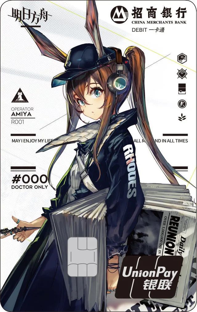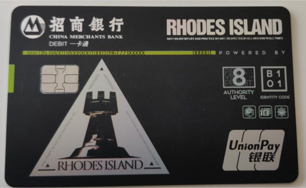 一款是黑色罗德岛款联名卡面。罗德岛制药公司是手游里玩家所在的阵营,同时《明日方舟》也是一款非常注重细节的游戏,本次联动也体现的淋漓尽致,卡面上B101的编号,是博士的编号,突出了卡主人的身份,作为罗德岛的战术大脑的博士们怎么能不拥有一张呢?