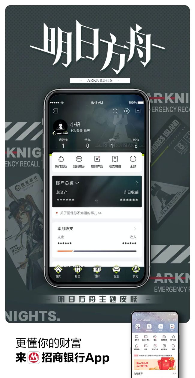 作为本次联动了另一方「招商银行」也配合卡片的发行上架了两款APP皮肤,还有四条游戏内音效的提示音噢!让持卡玩家进入APP时获得更多的沉浸感与代入感。