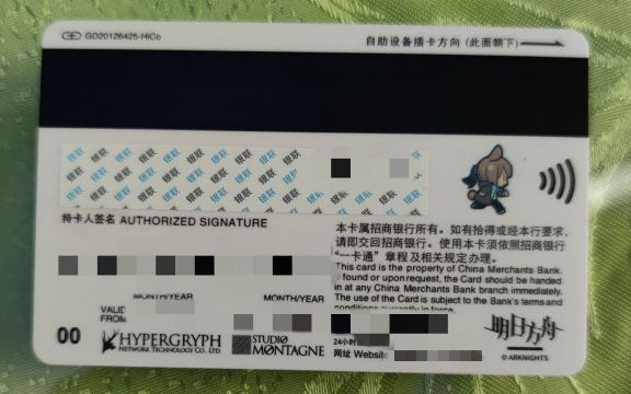 卡的背面也展现出了更多的细节,第一眼看到的是在卡的感应区域出现了一个Q版的阿米娅提示博士正确的感应和插卡方向。其次下方的字体也是标准的明日方舟美术风格「HYPERGRYPH」「STUDIO MONTAGE」这一波不得不说细节拉满。