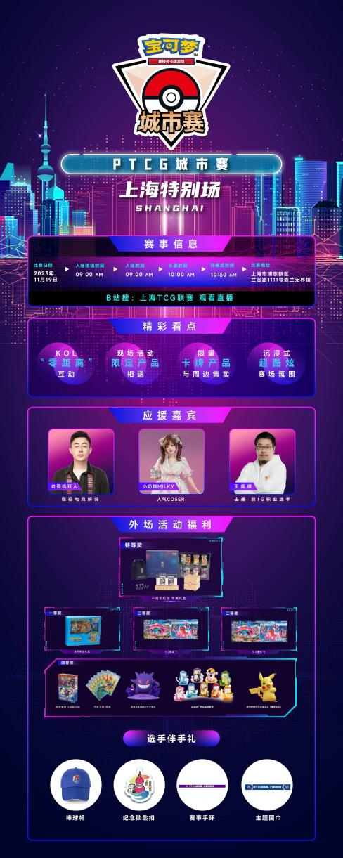 各位想要成为宝可梦大师的训练家们,2023年11月19日,一场独一无二、充满惊喜的宝可梦TCG城市赛特别场即将到来!本次活动在上海浦东新区森兰无界馆举行,现场将有23名来自全国各地的PTCG知名选手、主持解说,还有卡牌圈、游戏圈、二次元coser等众多知名KOL齐聚一堂。