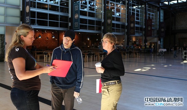 制作特辑(1:48):故事组员工用Pitch Doctor软件绘制分镜画稿、一些动画师测试早期角色动画以及真人模拟角色动作。此图为导演Dan Scanlon、制片人Kori Rae与脚本监督Amanda Jones在总部中庭进行简短的会议,摄于2012年10月8号。