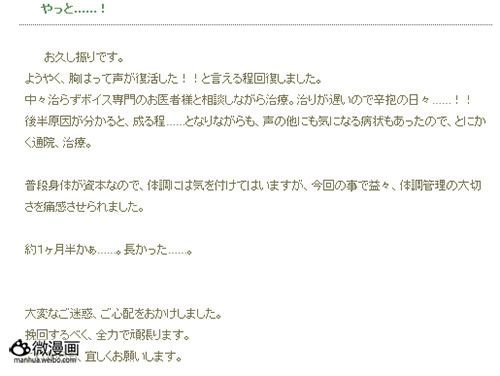曾出演《蔷薇少女》翠星石、《魔法先生》绫濑夕映、《凉宫春日的忧郁》朝仓涼子等角色的知名声优桑谷夏子在5月宣布因为声带方面的疾病,将休养一段时间。现在6月18日桑谷夏子在博客宣布,经过约一个半月的调整,自己已经到了可以挺胸说“复活”(痊愈)的程度,并对大家的担心表示感谢。