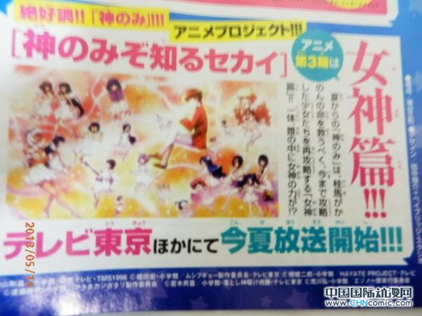 据悉,改编自若木民喜人气漫画的TV动画《只有神知道的世界》第三期将于7月在东京电视台开播。漫画《只有神知道的世界》描写擅长GALGAME游戏的攻略之神桂木桂马,偶然间与从地狱来的驱魂恶魔少女艾露西相遇,开始了攻略现实中女生来协助驱魂的故事。此前若木民喜曾于4月初在推特泄露第三期将于7月开播,面对漫画家武村勇治(若木民喜曾是武村勇治的助手)对动画第三期的期待,若木民喜表示“我也同样的期待,很快就到了呢,7月什么的”。这次则是正式官方发表。漫画由若木民喜创作,自2008年开始在《周刊少年SUNDAY》连载。此前已经两度TV动画化,分别于2010年10月和2011年4月放送。另外推出有OVA/OAD动画《4人与偶像》《天理篇》,最新OVA《魔法少女STAR花音100%》预定6月18日和漫画第22卷同捆发售。
