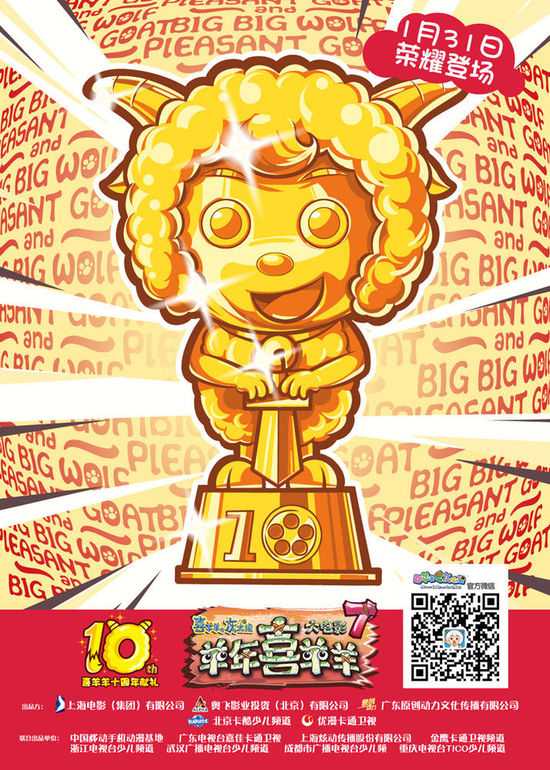 《喜羊羊与灰太狼7》概念海报网易娱乐12月4日报道 日前,由上海电影(集团)有限公司、奥飞影业投资(北京)有限公司、广东原创动力文化传播有限公司出品,北京卡酷少儿频道、优漫卡通卫视联合出品的电影《喜羊羊与灰太狼7》首次曝光了一款极具趣味性的概念海报,海报中闪闪发亮的“喜羊羊奖杯”犹如奥斯卡小金人一般惹人注目。同时片方还宣布大电影《喜羊羊与灰太狼7》将于2015年1月31日全国公映,羊年上映又恰逢“喜羊羊系列”诞生十周年,精彩欢乐元素随处可见,十分值得期待。“萌系”小金人奖杯光彩夺目 品牌十周年献礼大银屏大电影《喜羊羊与灰太狼7》曝光的概念海报中“喜羊羊奖杯”是海报的绝对主角,海报中小金人奖杯金光闪闪光彩夺目,奖杯上的“10”字样代表着喜羊羊这一品牌已经陪伴观众十年之久,不少观众都纷纷感叹时光荏苒。据了解,自2005年6月“喜羊羊”面世以来,动画的收视率最高达到了17.3%,大大超过了同时段播出的境外动画片,刷新了国产动画的新记录。“喜羊羊”也于2009年首次被搬上大银幕,之后迅速成为了众多小朋友和家长春节必看的亲子电影之一,也因此引领了国产动画电影的新潮流。近年来国产动画产业处于快速发展的时代,每年都会涌现出一些新的国产动画形象,越来越多的国产动画都模仿“喜羊羊”的成功模式,但是都没有像“喜羊羊”一样获得如此深入人心的强烈影响力。经过十年的积累,“喜羊羊”品牌无论是制作水平还是后期团队,都已经具备了国产动画的最高水准,“羊7”在此基础上又兼具了故事创新、情节强大等元素。由此可见,“喜羊羊”十周年献礼作品将会凭借最精良的制作和最精彩的故事为国内电影市场带来强有力的冲击。“合家欢”氛围预热春节档 喜羊羊之父回归全面升级据悉,大电影《喜羊羊与灰太狼7》迎来了“喜羊羊之父”黄伟明先生的回归。十年前,黄伟明创作的“喜羊羊”形象自问世以来就得到了众多小朋友和家长的喜爱,至今都风靡全国,此次黄导回归喜羊羊大电影的创作让很多粉丝对“羊7”的期待值爆棚。在黄导的亲自操刀下,《喜羊羊与灰太狼7》除了神秘角色的加入之外,影片在故事、形象以及制作等各个方面都做出了重大“升级”,动画制作和影片观感等方面更是不惜重金采用了时下最先进的技术,致力于构建一个宏大精致的远古奇幻世界。新颖的剧情、全新的故事架构、看点十足大场面戏份、“全年龄”观影人群的定位……这些都决定了影片在传播正能量的同时也保证了影片本身的可看性和娱乐性,充分迎合了当下火热的“亲子观影”热潮与春节“合家欢”的大氛围。黄伟明表示道,这次回归“羊7”虽然自己在故事情节作了重大的创新,但仍然坚持了“喜羊羊”本身开心、爆笑、本真、勇敢等特点,相信“羊7”会带大家体验一段轻松欢快的电影旅程。《喜羊羊与灰太狼7》最终将档期锁定在2015年1月31日,正式宣告以勇敢、忠诚、正能量为武器高调杀入春节贺岁片档期,让本已群雄混战的春节档更具悬念。