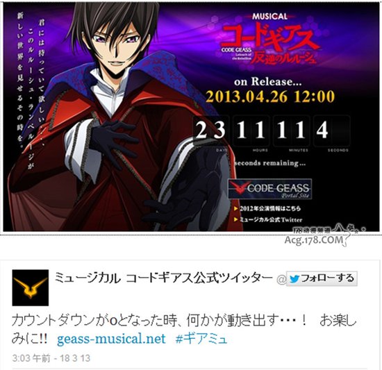 近日,动画《反叛的鲁鲁修》一个音乐倒计时网站上线,官方在推特中称,到了2013年4月26日的晚间O时,将有神秘消息公开。至于这个神秘的内容是什么,FANS猜测说可能是新作?或者是重播?但小编觉得音乐这个词很令人在意,不会是音乐剧神马的吧?总之请等待倒计时结果的最终揭晓。白发版的鲁鲁修动画《反叛的鲁鲁修》由谷口悟朗执导、CLAMP人设、大河内一楼脚本,并由日升制作的原创动画,第一季从2006年10月至2007年3月播出,续作R2从2008年4月至9月播出。本作在设计初期谷口悟朗将鲁鲁修设定为白发,不过后期被改为黑发。鲁鲁修亦被评为2000-2009年代最人气男性角色冠军,同时也是月刊Newtype创刊25年总选举获得人气投票数最高的角色。此外,动画《反叛的鲁鲁修》的外传剧场版《亡国的阿基德》也在去年开始上映了第1章,该剧场版共分为4章内容。第2章则在今年夏季公开。而且官方还曾在推特中表示《亡国的阿基德》第2章将开启,并称“那个角色”将要登场!【故事简介】皇历2010年8月10日,超级大国“不列颠帝国”(Britannia)为了夺取日本的地下资源而侵略日本,在不列颠帝国强大的兵器Knightmare进攻下,日本在不到一个月的时间内被征服。日本被剥夺了自由、权利甚至是国家的名字,不列颠帝国将“日本”改称为“11区”,“日本人”这名词则被11这数字所取代。表面上看来不列颠帝国的统治似乎牢不可破,但其中早已出现了裂痕。七年后的2017年,在生死边缘获得C.C.授予“Geass”的力量,立志要粉碎不列颠帝国的黑色皇子鲁鲁修,以及获得第七世代人型机甲兰斯洛特,立志从帝国内部进行改革的白色骑士枢木朱雀,影响了整个世界。