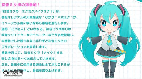 史上第一次以初音未来冠名的电视节目《初音未来的 未来未来制造未来!》(原名『初音ミクの ミクミクメイクミク!』)将在2013年8月2日开始在网络电视台Hikari TV播出。