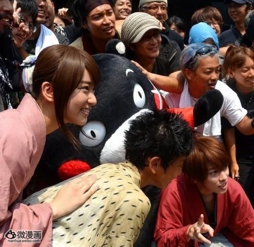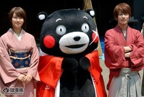憨态可掬的KUMAMON身着剑心的红色上衣,左脸画了十字伤痕。饰演绯村剑心的人气男星佐藤健 大赞“非常有剑心的气势”。佐藤健说,自己一直很喜欢KUMAMON,他感慨道,能和人气人物面对面交流真的很开心。武井咲则表示,有KUMAMON助阵,情绪顿时高涨了起来。剧组还收到了KUMAMON送来的西瓜、桃子、哈密瓜等熊本县当地特产。