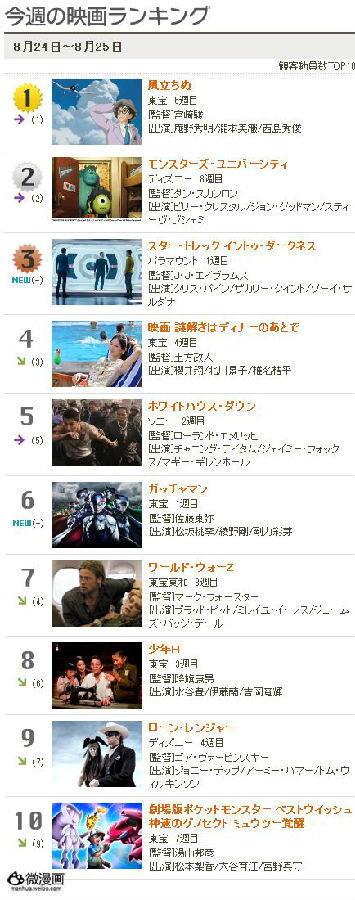 据《每日新闻》援引興行通信社数据,7月20日上映的宫崎骏监督最新动画电影《起风了》在8月24~25日周末2天观众23万7700人次,票房3亿2100万日元,连续6周问鼎日本周末票房榜。目前《起风了》上映37天,累计观众人数640万人次,累计票房也已突破80亿日元,预计10月前可以突破百亿票房大关。