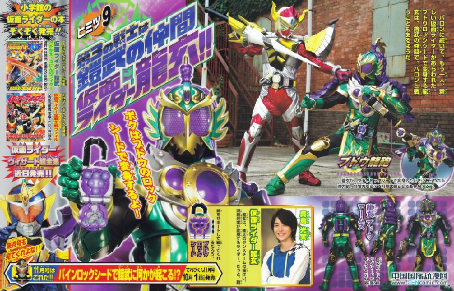 东映制作的新作特摄剧《假面骑士铠武》将于10月6日开播,现在本作官网、最新视觉图和制作阵容都已经公开。值得一提的是担任本作脚本的是曾为《沙耶之歌》《魔法少女小圆》《翠星之加尔冈蒂亚》等游戏和动画编剧的人气剧作家虚渊玄。这次开播的《假面骑士铠武》是平成假面骑士第15部作品,主题是假面骑士战国时代,假面骑士们使用以水果为原型的LockSeed进行变身,变身后的铠甲也充满了水果元素。主演是1992年出生的佐野岳,曾出演《麻辣教师GTO2012》《搜查地图之女》《鸭,去京都~老字号旅馆的女老板日记》等剧。舞台是某个依靠巨大企业发展起来的新兴都市,整个城市就像是这家企业的“城下町”。在这里流行起通过LockSeed召唤小动物进行对战的游戏,结果造成过多的异世界之门被打开,从中出现的怪物让人类面临危机。在这一背景之下,偶然成为假面骑士铠武的主人公葛叶紘汰被卷入了战斗。还有众多同为假面骑士的对手登场。 《假面骑士》系列是日本漫画大师石森章太郎原作,东映自1970年代起制作播出的特摄剧集,讲述人类所变身的假面骑士与邪恶组织对抗的故事,在昭和年代共制作播出了8部作品,在平成年代已制作播出15部作品。【STAFF】原作:石之森章太郎脚本:虚渊玄 等监督:田﨑竜太、柴﨑貴行 等制作人:佐々木基(朝日电视台)、武部直美(东映)制作:朝日电视台、ADK、东映【CAST】假面骑士铠武(葛葉紘汰):佐野岳假面骑士巴龙(駆紋戒斗):小林丰假面骑士龙玄(吴岛光实):高杉真宙高司舞:志田友美吴岛贵虎:久保田悠来チャッキー:KANONリカ:MIINAラット:小泽廉ザック:松田岳ペコ:百濑朔葛叶晶:泉里香阪东清治郎:弓削智久錠前ディーラー シド:波冈一喜DJサガラ:山口智充