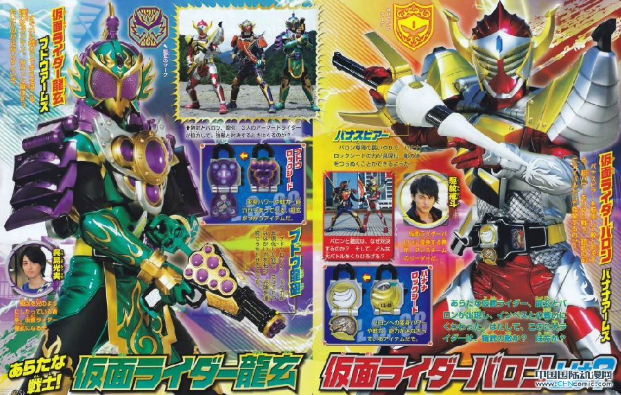 下面欣赏下《假面骑士铠武》龙玄杂誌图~最强必杀技 薙刀无双飞刃!!无双军刀与大橙丸合体,薙刀模式完成!