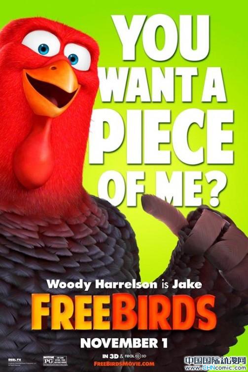 吉米·海沃德执导的全新动画片《时光鸡大作战》海报。影片的主角为两只火鸡,它们乘坐时空穿梭机回到第一个感恩节,要把火鸡从人类菜单上删掉。2013年11月1日北美上映。