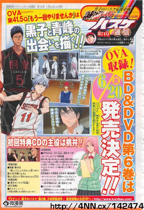 据杂志消息,人气动画《黑子的篮球》宣布推出新作OVA,预定6月20日发售的TV动画《黑子的篮球 2nd season》BD/DVD第6卷将同捆OVA第41.5话《不再做一次吗》。第41.5话将基于原作漫画第124话改编,回想青峰与黑子的初遇。同时也包括黑子的篮球才能被“奇迹世代”的成员们所发现,以及青峰被挖到桐皇的始末。除此之外BD/DVD第6卷还将收录TV动画第40话和第41话。初回限定版将同捆女主角桃井五月担任主角的音声DRAMA CD。