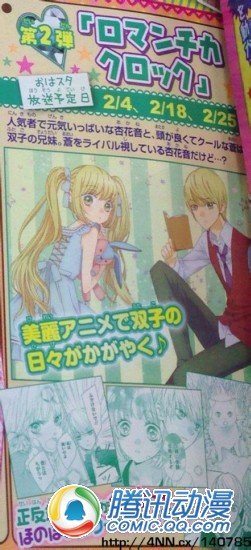 由槙阳子连载于《RIBON》上的漫画《浪漫时钟》前阵子传出即将动画化的消息。而根据最新情报,这部作品的播出档期也已经公布。播出时间为2月4日、2月18日与2月25日。从日期可以看出,这次的动画化并非TV系列,而是以类似OVA或者OAD的形式播出。《浪漫时钟》以双胞胎兄妹——加治屋杏花音和加治屋苍为主角,前者拥有漂亮的脸蛋,性格也十分活泼;后者则头脑聪明,喜欢小动物。不过这两人却是一对欢喜冤家,总是在吵架。而这部作品,就是围绕两人吵吵闹闹的日常生活展开的。画风十分清新,在近年来崇尚暴力和卖肉的动漫当中也属于让人治愈的作品。喜欢的朋友千万不要错过。