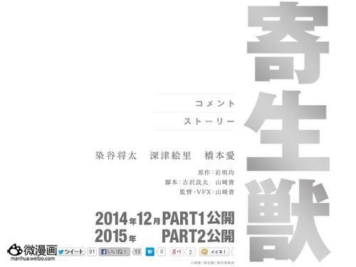 据东宝院线消息,日本漫画家岩明均于1990年-1995年在讲谈社《月刊Afternoon》连载的经典科幻恐怖漫画《寄生兽》宣布真人电影化,将改编成2部曲分别在2014年12月和2015年上映。同时TV动画企划也宣布始动。