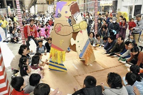 日本大分县近日别出心裁,举行了一场用纸板做成的“相扑”比赛。提起日本相扑,大家可能会第一时间联想到两个身材“巨大”的力士在一块圆形擂台上对决的画面,但是日本大分县近日别出心裁,举行了一场用纸板做成的“相扑”比赛。据日本《读卖新闻》4月1日报道,日本大分市商业街竹町巨蛋广场1日上演了一场别开生面的“纸板相扑大赛”。此次参赛的纸板相扑选手均是以动漫、当地著名人物为原型制作而成。这18名纸板相扑选手展开酣战,使现场气氛一下沸腾起来。大分县教育委员会创办此次“纸板相扑人大赛”,意在为2015年年初县美术馆的开馆做铺垫。美术组“KOSUGE1-16”土谷享担任策划指导,让18个组分别用记号笔在纸板画出图案,制成18名身高1.8左右的相扑选手。此次比赛以“竹町赛点千秋乐”为主题,用木板制作了相扑比赛场(直径2.7米)。参与者一边喝彩助威,一边用双手拍木板进行激战,玩的不亦乐乎。