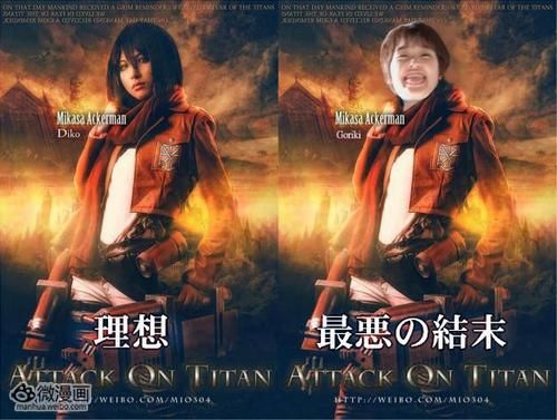 而人气角色利威尔兵长,则被认为可以让搞笑风格的主持人有吉弘行饰演,不过有吉弘行的身高可是有172.3厘米。追根求源,其实刚力彩芽出演三笠、有吉弘行出演利威尔都是之前推特上流行过的恶搞,当时甚至已经有网友制作出了两人的假想剧照。