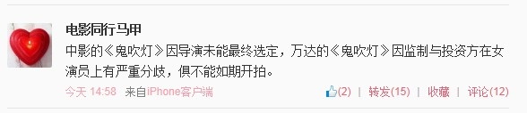 12月15日下午,微博名为“电影同行马甲”写道:中影的《鬼吹灯》(实为《寻龙诀》)因导演未能最终选定,万达的《鬼吹灯》因监制与投资方在女演员上有严重分歧,俱不能如期开拍。