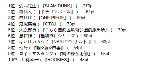 漫画当中会有不少极具魅力的主人公登场。不过支持他们成长的往往都是无法忽视的“师父·长辈角色”。虽然漫画只是虚构,不过你希望这其中哪些人成为自己的上司呢?对此近日日本雅虎进行了调查。■最接近“理想上司形象”的漫画角色TOP10第1位安西教练(《灌篮高手》)270票第2位龟仙人(《龙珠》)161票第3位白胡子(《航海王》)80票第4位鬼冢英吉(《GTO麻辣教师》)73票第5位大原部长(《乌龙派出所》)70票第6位岛耕作(《岛耕作》系列)68票第7位旗木卡卡西(《火影忍者》)63票第8位幻海(《幽游白书》)54票第9位罗伊·马斯坦(《钢之炼金术师》)53票第10位川藤幸一(《菜鸟总动员》)48票毫无悬念获得第一位的是名作篮球漫画《灌篮高手》中的安西教练。相信大家都曾经听说过他的那句名言“放弃的话,比赛就提前结束了哦……?”而正如教练所言,这样一个能够给人动力的角色的确是最理想的上司了。以下就介绍一下选择每个角色的受访者所发表的看法吧。【第1位安西先生(《灌篮高手》)270票】“似乎能够将部下的能力最大限度发挥出来。”“不光是技术,在精神层面也很重要。”“平时不会多说什么,但是关键时刻非常靠谱。”“基本上很温柔。他会经常关注大家,并且提供理想的建议。”【第2位龟仙人(《龙珠》)161票】“那种从容度过人生的想法让我产生了强烈的共鸣。”“在修行的时候会做示范,并且一起努力,这一点赢得很高评价。”“作为指导者非常出色,同时又很温柔,对于弟子的关爱不言而喻。”【第3位白胡子(《航海王》)80票】“非常为部下着想。”“能够产生一种自我牺牲的精神。”“可以严肃可以幽默。同时很强大。”【第4位鬼冢英吉(《GTO麻辣教师》)73票】“能够对于大家的意见和行为保持宽容态度。”“能够让人有干劲。关键时刻靠谱。”【第5位大原部长(《乌龙派出所》)70票】“会为了部下着想。”“给人认真的印象。不会放人鸽子。”【第6位岛耕作(《岛耕作》系列)68票】“无论工作还是恋爱都正儿八经。”【第7位旗木卡卡西(《火影忍者》)63票】“能温柔地守护大家,危机时伸出援手。”【第8位幻海(《幽游白书》)54票】“对人对己都非常严厉而公平。”【第9位罗伊·马斯坦(《钢之炼金术师》)53票】“为了这个人,我觉得会努力工作的。”【第10位川藤幸一(《菜鸟总动员》)48票】“这是一个比起严厉,更优先选择温柔的上司。”作品当中,上司角色会通过严厉或温柔的话语引导主人公。而如果我们的身边也有这样一种上司的话……不过毕竟只是虚构角色吧。指望现实中的上司这样子恐怕很难啊……