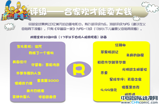 虽然主流市场上,动画片都是合家欢电影。但也有一些制作团队,对动画的理解不限于“小孩子看的东西”。因此我们也能看到,不少欧美、日本、法国等地的动画,题材各异,还关注到了人类生存过程中的种种命题。由于这些动画中的血腥、暴力、情色等元素,往往被评为R级(17岁以下由成人陪同观看)。另需一提的是,《怪猫菲力兹》(1972)当初被定为X级。但X级逐渐沦为色情的代名词。从1990年开始,X级被NC-17级(17岁以下不可观看)取代。